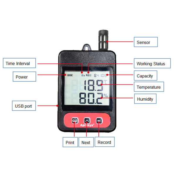 2, the LCD screen can display temperature,time interval, battery level, work status, the amount of data.